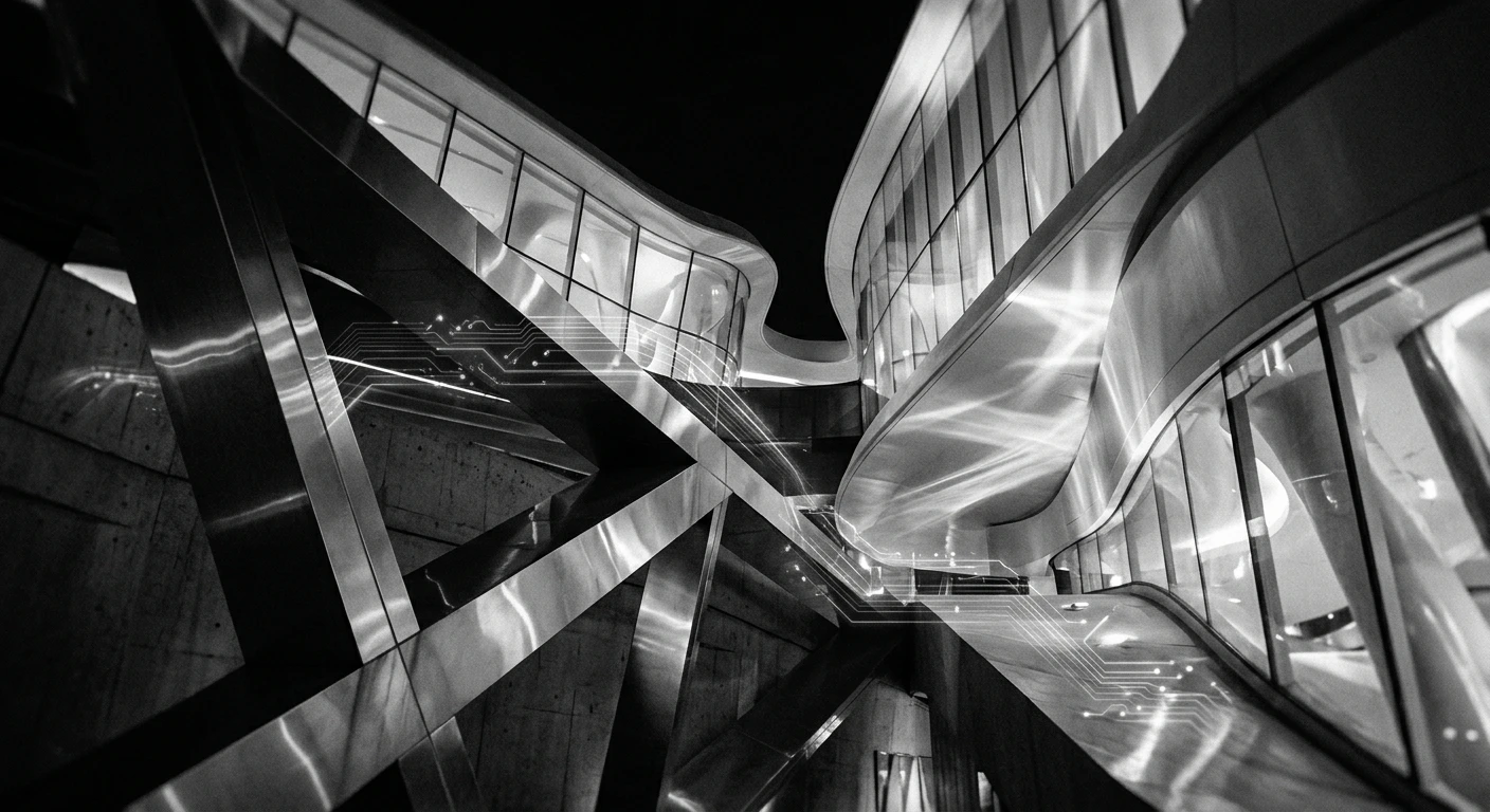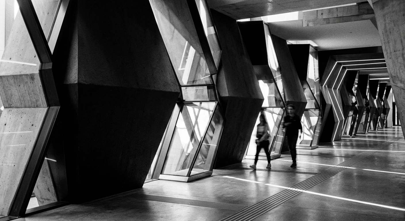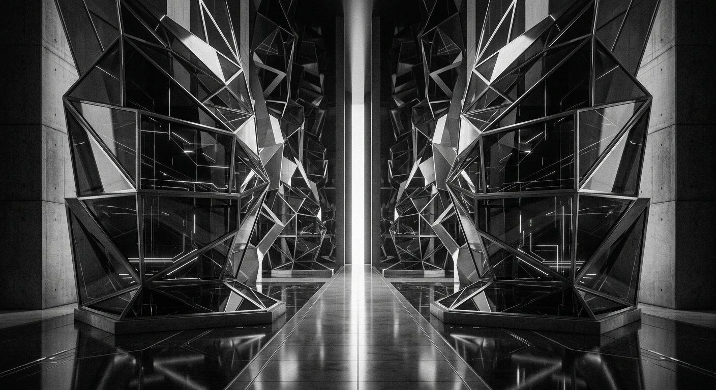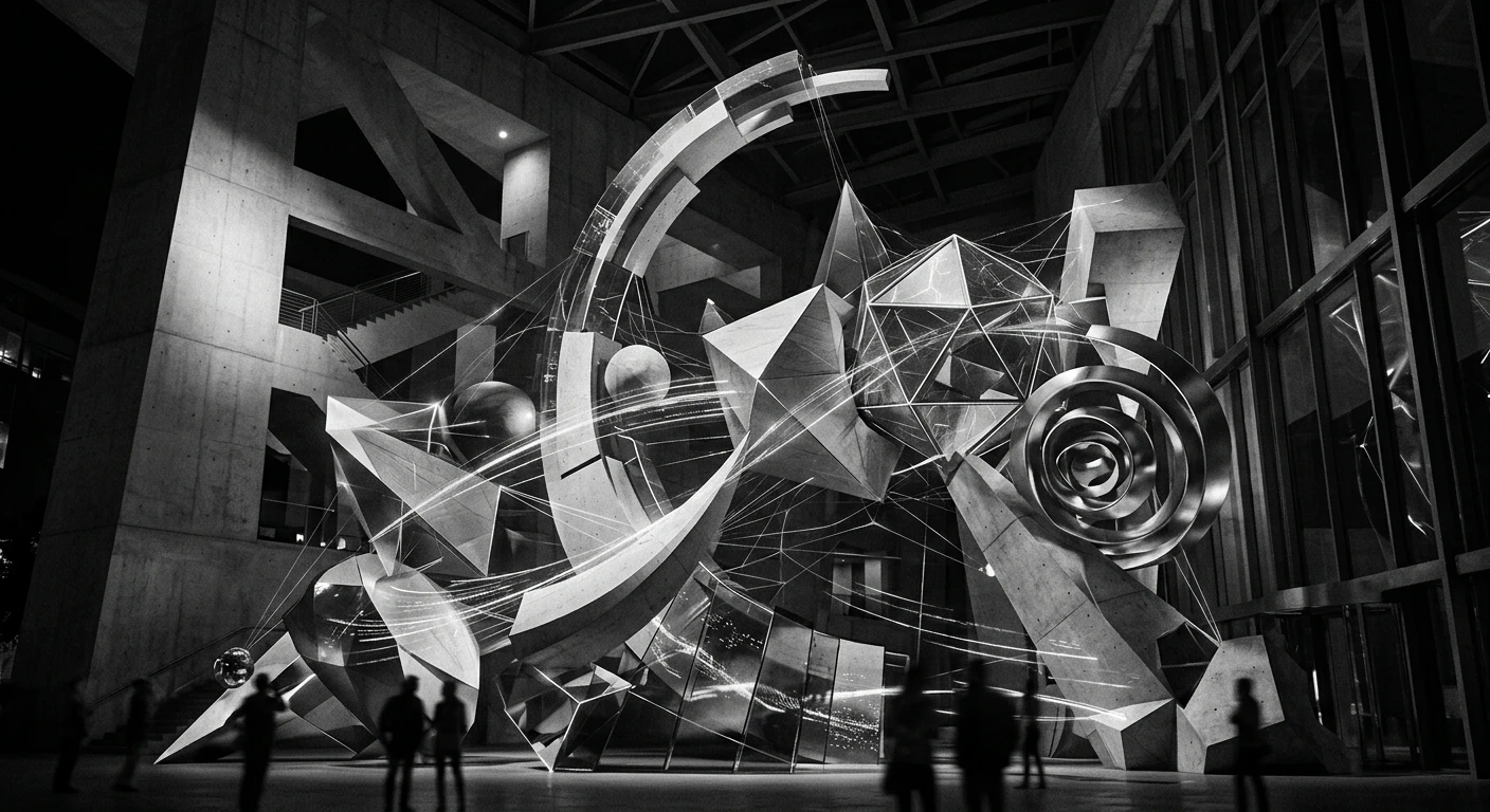 In this article, we explore each principle through specially crafted AI-generated black and white photographs that embody the cinematic, modern aesthetic described in our image generation guide. Each photograph uses sleek futuristic geometric shapes, subtle digital connections, light reflections on glass surfaces, and deep contrasts (chiaroscuro) to visually communicate the essence of each design principle.