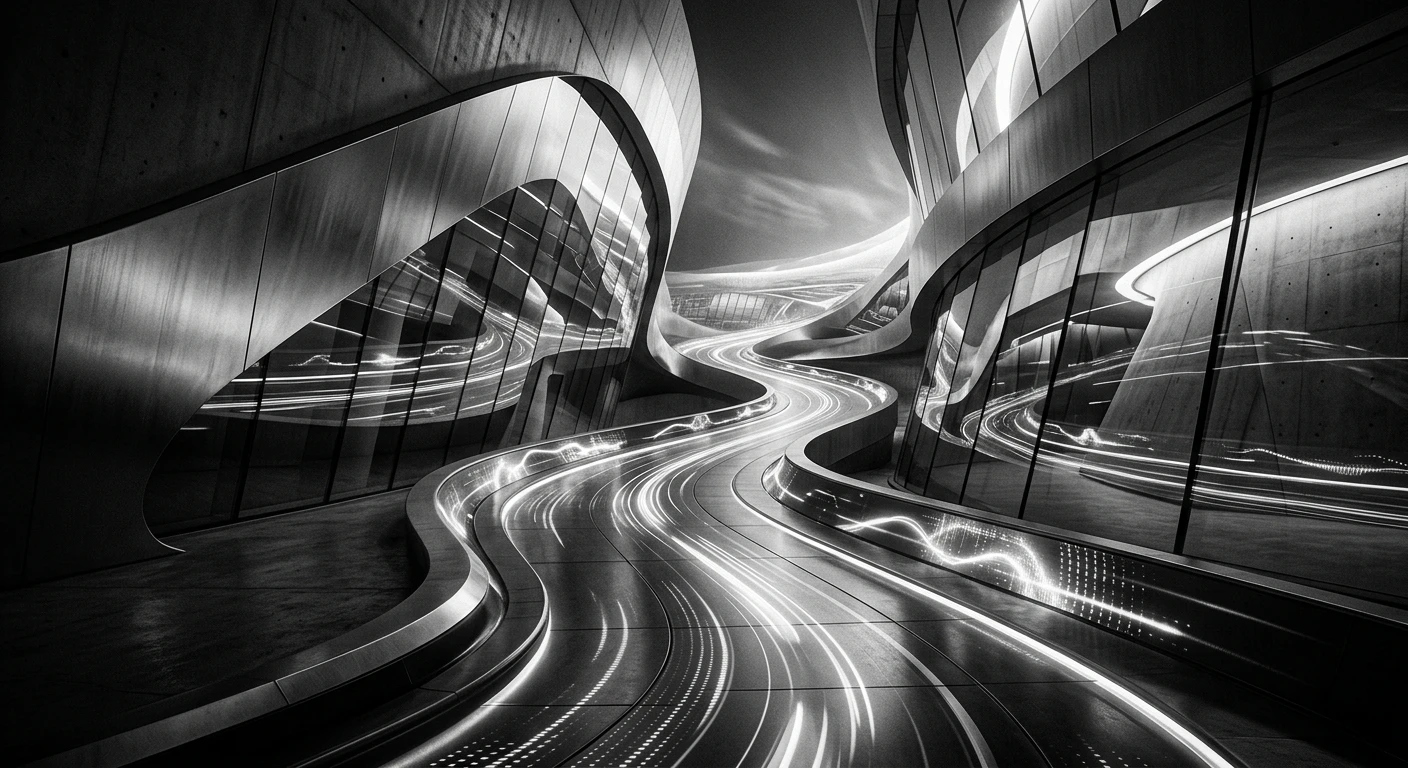 A cinematic, modern, black and white photograph representing movement in design. Sweeping curved geometric forms create a flowing pathway that leads the eye from foreground to background. Subtle digital connections pulse with energy along this path while light reflections on glass surfaces follow the directional flow. Contrasting light and dark areas create rhythm within the movement. No text.