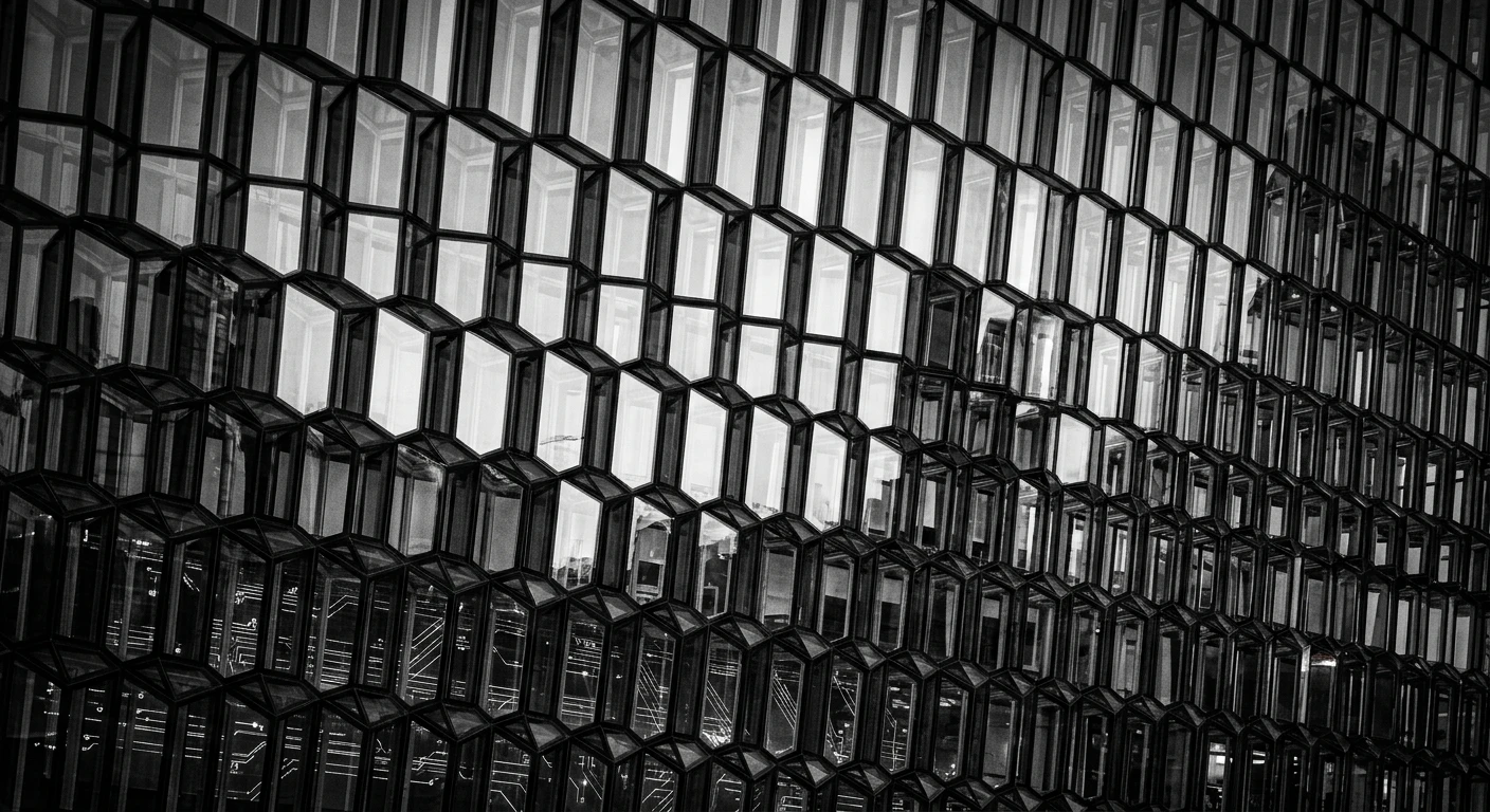 A cinematic, modern, black and white photograph representing pattern in design. Repeating geometric shapes create a rhythmic tessellation that extends across the frame, with subtle variations preventing monotony. Light reflections on glass surfaces highlight the repeating elements, while digital connections form a secondary pattern beneath the primary arrangement. Deep contrasts emphasize the regularity of the repetition. No text.
