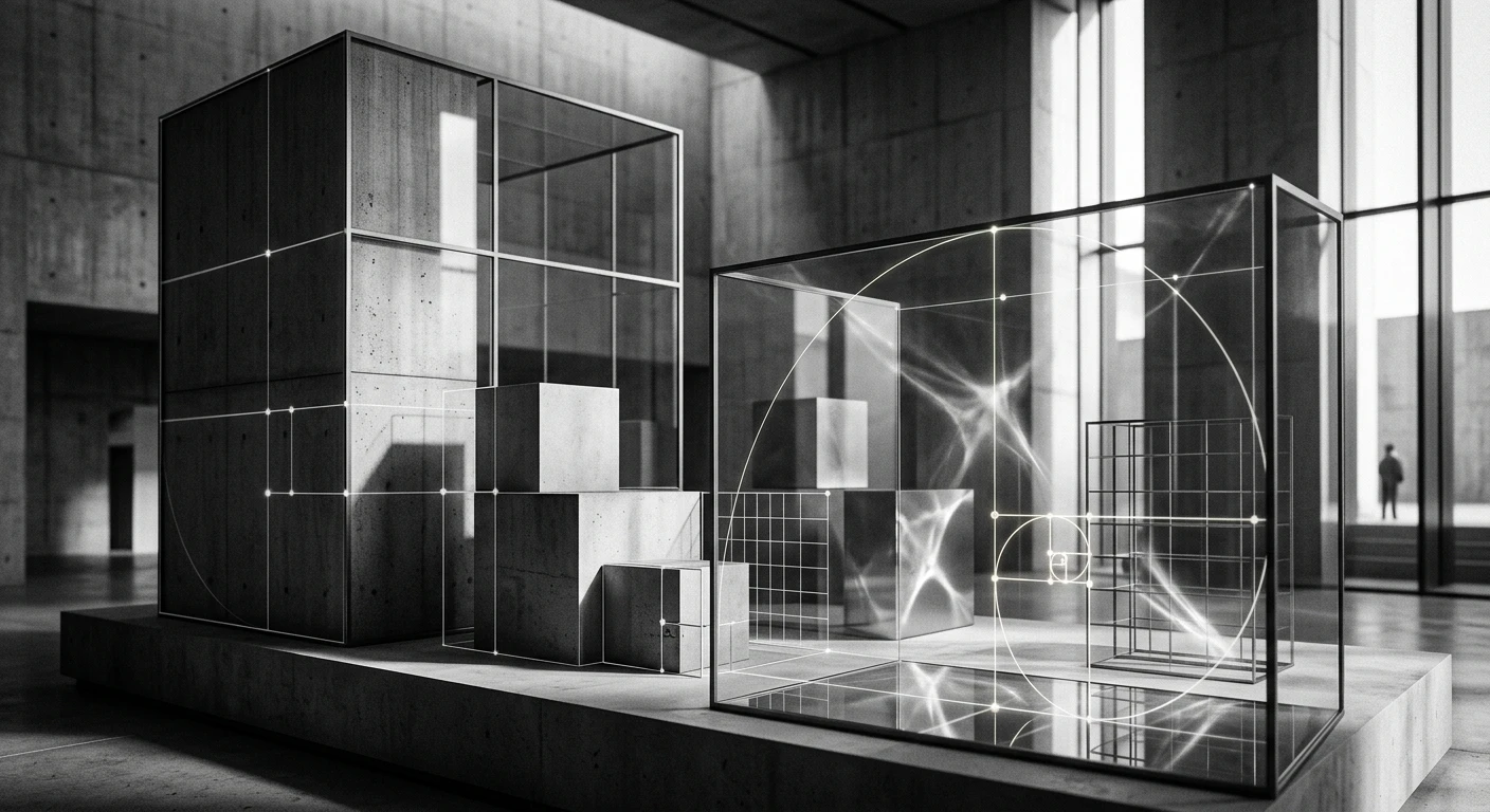 A cinematic, modern, black and white photograph representing proportion in design. Geometric forms of varying scales relate to each other through clear mathematical relationships (golden ratio, rule of thirds). Subtle digital connections illustrate the proportional relationships, while light reflections on glass surfaces highlight the harmonious scaling. Deep contrasts emphasize the size relationships between elements. No text.
