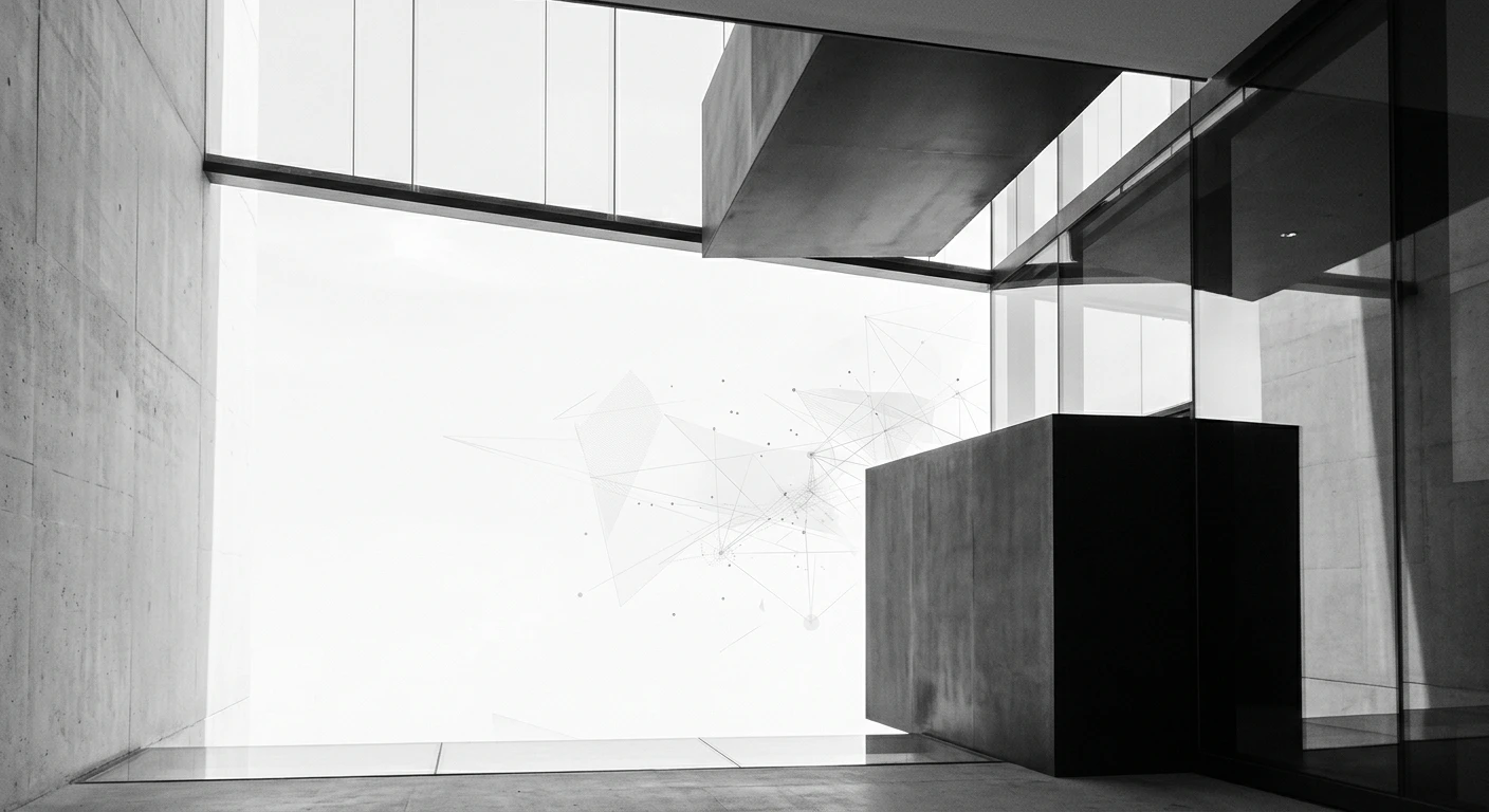A cinematic, modern, black and white photograph representing white space in design. Bold geometric forms float in expansive areas of light and shadow with careful attention to the relationships between form and emptiness. Subtle digital connections hover in the negative space suggesting potential rather than occupation. Light reflections on glass surfaces define the boundaries between form and space. Deep contrasts emphasize both the presence of elements and the importance of what surrounds them. No text.